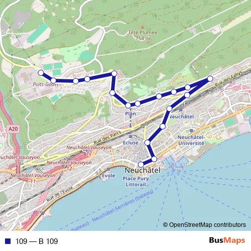 The first stop of the 109 bus route is Neuchâtel, Place Pury and the last stop is Neuchâtel, Trois-Chênes. 109 (B 109) is operational during täglich.
