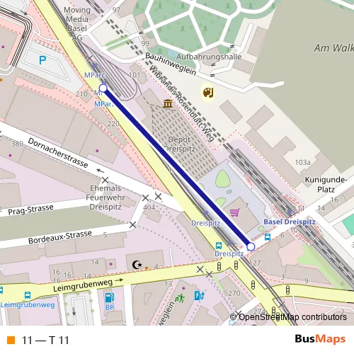 The first stop of the 11 tram route is Basel, Dreispitz and the last stop is Basel, Mparc. 11 (T 11) is operational during täglich.