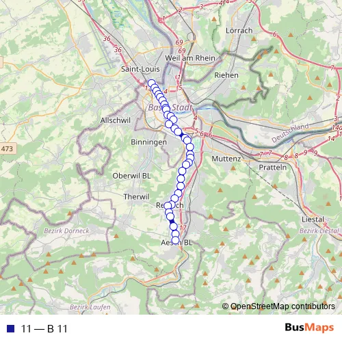 The first stop of the 11 bus route is Basel, St-Louis Grenze and the last stop is Aesch BL, Dorf. 11 (B 11) is operational during täglich.