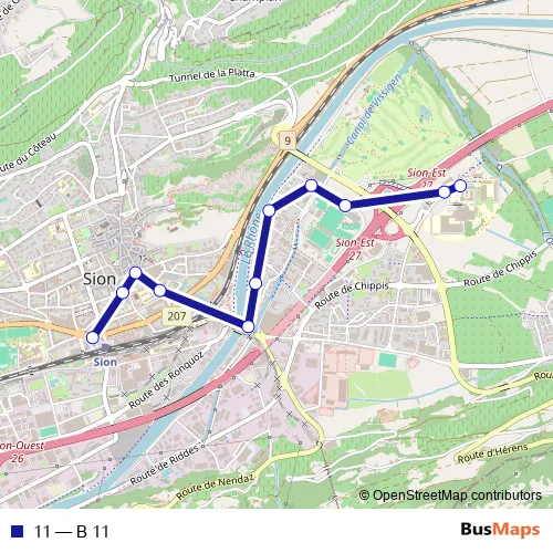 The first stop of the 11 bus route is Sion, Gare Bus Sédunois and the last stop is Sion, Suva. 11 (B 11) is operational during täglich.