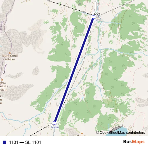 The first stop of the 1101 cable-car route is Siviez (station aval) and the last stop is Tortin (Siviez). 1101 (SL 1101) is operational during täglich.