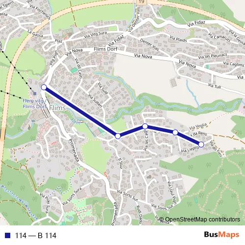 The first stop of the 114 bus route is Flims Dorf, Bergbahnen and the last stop is Flims Waldhaus, Lieptgas. 114 (B 114) is operational during täglich.