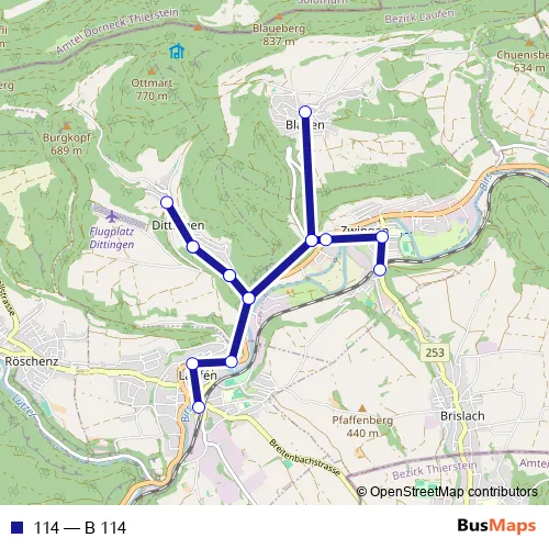 The first stop of the 114 bus route is Laufen, Bahnhof and the last stop is Zwingen, Bahnhof. 114 (B 114) is operational during täglich.
