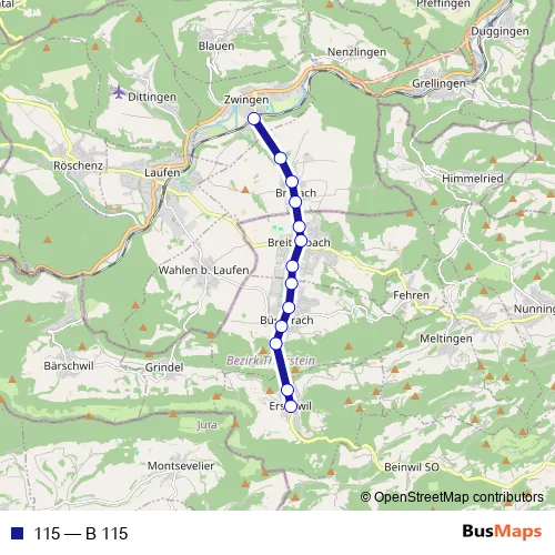 The first stop of the 115 bus route is Zwingen, Bahnhof and the last stop is Erschwil, Dorf. 115 (B 115) is operational during täglich.