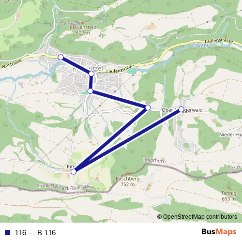 The first stop of the 116 bus route is Kleinlützel, Ölibächli and the last stop is Kleinlützel, Huggerwald. 116 (B 116) is operational during an Werktagen.