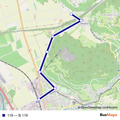 The first stop of the 119 bus route is Salaz, Vers les Moulins and the last stop is Bex, place de la gare. 119 (B 119) is operational during täglich.