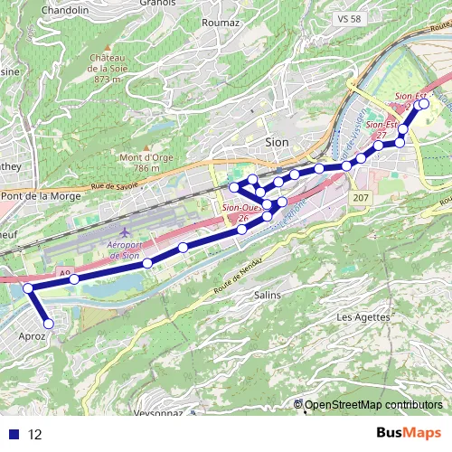 The first stop of the 12 bus route is Aproz, village and the last stop is Sion, Suva. 12 is operational during täglich.