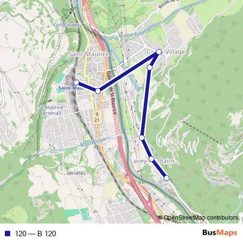 The first stop of the 120 bus route is Lavey-les-Bains, Et. Thermal and the last stop is St-Maurice VS, gare. 120 (B 120) is operational during täglich.