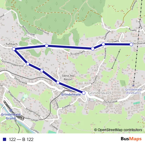 The first stop of the 122 bus route is Grindelwald, Bahnhof and the last stop is Grindelwald, Bodmi. 122 (B 122) is operational during täglich.