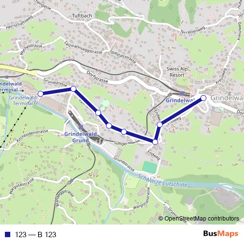 The first stop of the 123 bus route is Grindelwald, Bahnhof and the last stop is Grindelwald, Terminal. 123 (B 123) is operational during täglich.