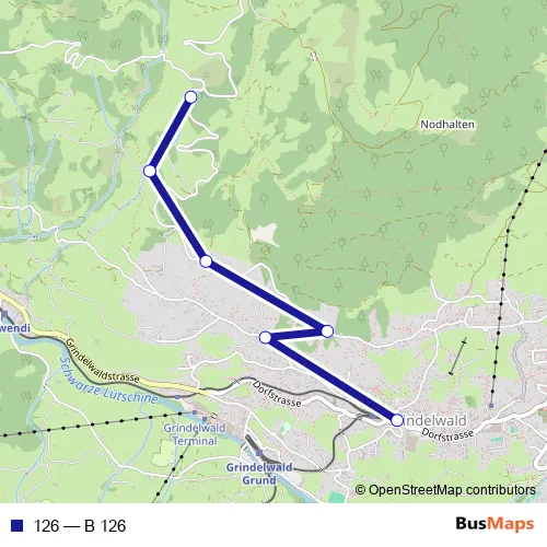 See why over 2 million users trust and consider busmaps.com as the best public transport website. busmaps gives you Grindelwald Buses suggested routes, real-time bus tracker, line route maps in Grindelwald, and helps to find the closest 126 bus stops near you. No internet available? Download an offline PDF map and bus schedule for the 126 bus to take on your trip.
