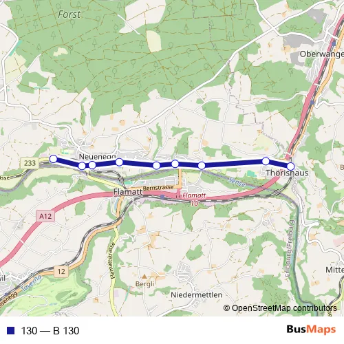 The first stop of the 130 bus route is Neuenegg, Louelemoos and the last stop is Thörishaus Dorf, Bahnhof. 130 (B 130) is operational during täglich.