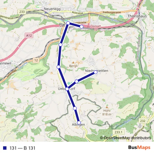 The first stop of the 131 bus route is Flamatt, Bahnhof and the last stop is Albligen, Dorf. 131 (B 131) is operational during täglich.