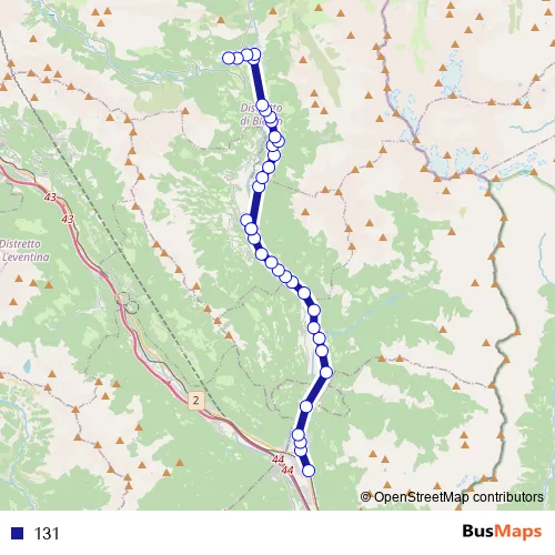 The first stop of the 131 bus route is Biasca, Stazione and the last stop is Olivone, Petullo. 131 is operational during täglich.