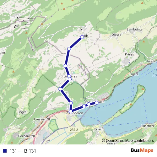 The first stop of the 131 bus route is La Neuveville, poste and the last stop is Nods, école. 131 (B 131) is operational during täglich.