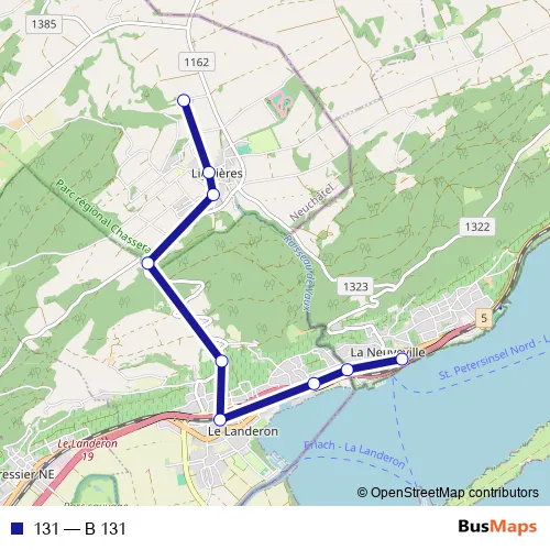 The first stop of the 131 bus route is La Neuveville, poste and the last stop is Lignières, Moulin Navilot. 131 (B 131) is operational during an Werktagen.