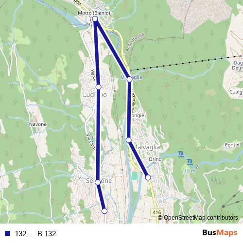 The first stop of the 132 bus route is Malvaglia, Orino and the last stop is Semione, Cantonetto. 132 (B 132) is operational during an Werktagen.
