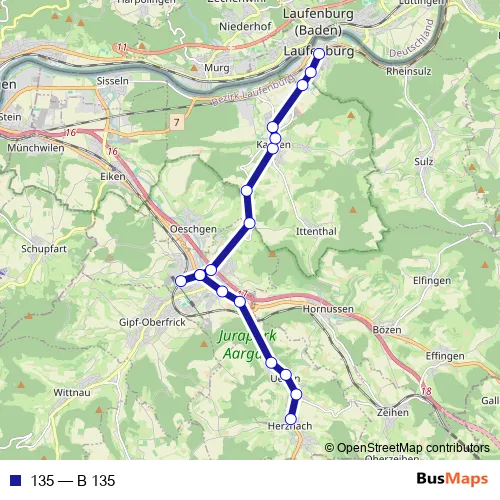The first stop of the 135 bus route is Herznach, Post and the last stop is Laufenburg, Bahnhof. 135 (B 135) is operational during an Werktagen.