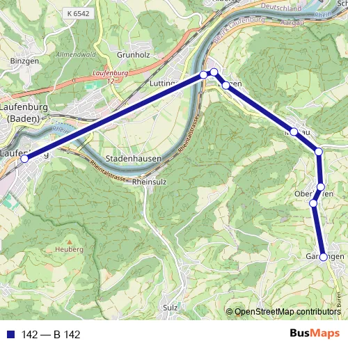 The first stop of the 142 bus route is Gansingen, Dorfplatz and the last stop is Laufenburg, Bahnhof. 142 (B 142) is operational during täglich.