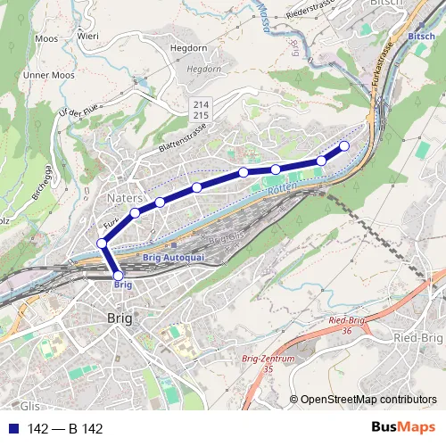 The first stop of the 142 bus route is Brig, Bahnhof and the last stop is Naters, Massegga. 142 (B 142) is operational during an Werktagen.