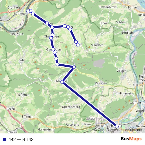The first stop of the 142 bus route is Brugg AG, Bahnhof/Zentrum and the last stop is Etzgen, Rheintalstrasse. 142 (B 142) is operational during täglich.