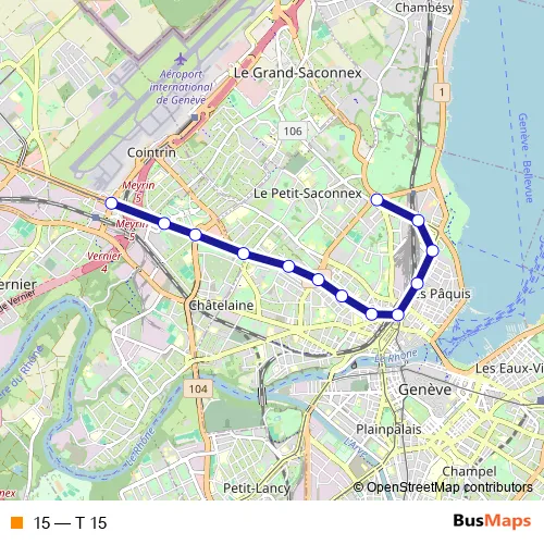 See why over 2 million users trust and consider busmaps.com as the best public transport website. busmaps gives you Geneve Trams suggested routes, real-time bus tracker, line route maps in Geneve, and helps to find the closest 15 tram stops near you. No internet available? Download an offline PDF map and bus schedule for the 15 tram to take on your trip.