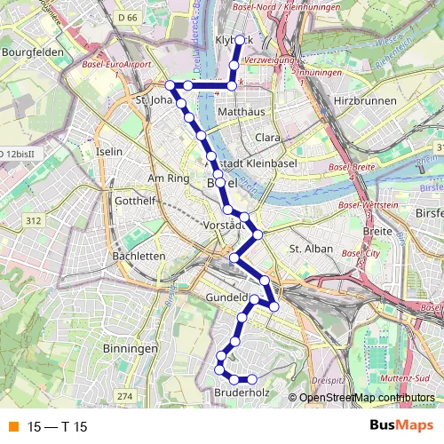 See why over 2 million users trust and consider busmaps.com as the best public transport website. busmaps gives you Basel Trams suggested routes, real-time bus tracker, line route maps in Basel, and helps to find the closest 15 tram stops near you. No internet available? Download an offline PDF map and bus schedule for the 15 tram to take on your trip.