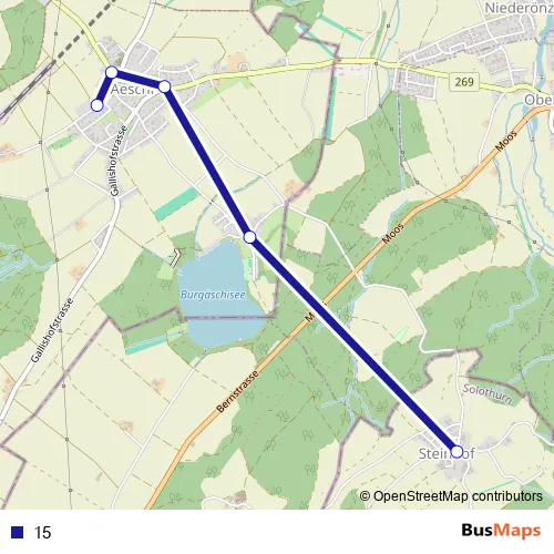 The first stop of the 15 bus route is Steinhof So and the last stop is Aeschi SO, Schulhaus. 15 is operational during an Werktagen.