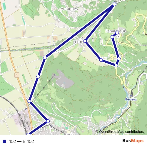 The first stop of the 152 bus route is Fenalet-sur-Bex, village and the last stop is Bex, place de la gare. 152 (B 152) is operational during täglich.