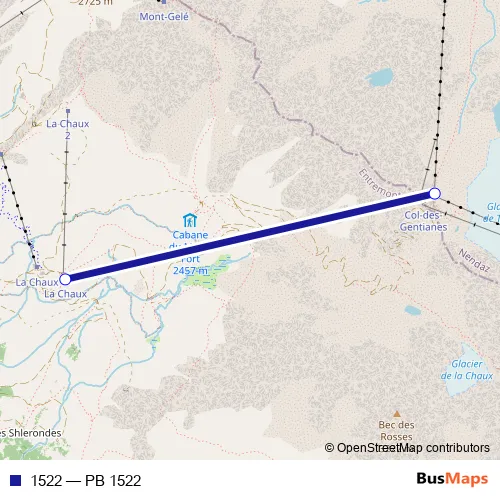 The first stop of the 1522 cable-car route is Col-des-Gentianes and the last stop is La Chaux Vs. 1522 (PB 1522) is operational during täglich.