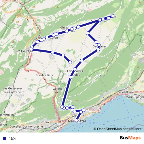 Place Pury - Faubourg de la Gare - Rue du Plan - Avenue des Cadolles - Route de Pierre-à-Bot - Rue Léo-Châtelain - Route de la Côtière - Rue des Doloires - Rue des Forgerons - Rue des Prayes - Route de la Tuilière - Grand'Rue - Route des Fontaines - Grand-Rue - Crêt Debély - Rue Frédéric Soguel - Avenue Robert - Avenue de la Gare - Rue du Commerce - Grand-Rue