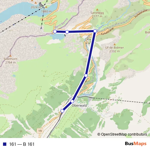 The first stop of the 161 bus route is Grimsel Passhöhe and the last stop is Oberwald, Bahnhof. 161 (B 161) is operational during täglich.