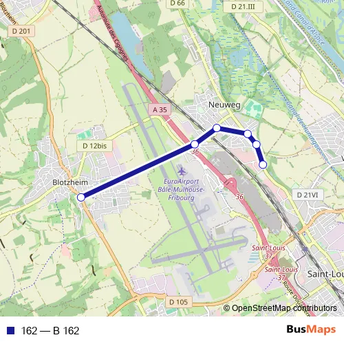 The first stop of the 162 bus route is St-Louis, Rue de Séville and the last stop is Blotzheim, École des Missions. 162 (B 162) is operational during an Werktagen.