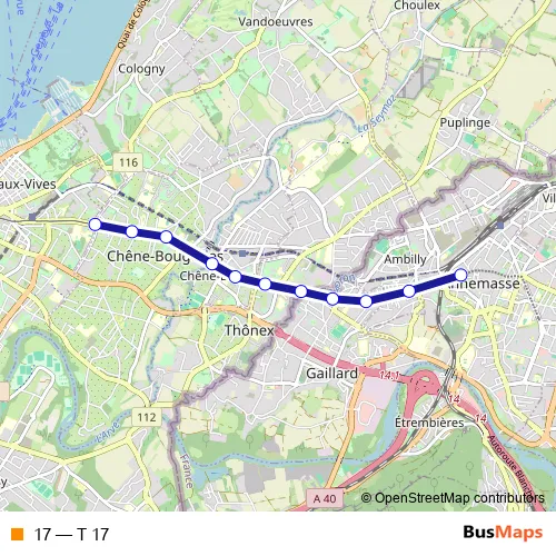 See why over 2 million users trust and consider busmaps.com as the best public transport website. busmaps gives you Geneve Trams suggested routes, real-time bus tracker, line route maps in Geneve, and helps to find the closest 17 tram stops near you. No internet available? Download an offline PDF map and bus schedule for the 17 tram to take on your trip.