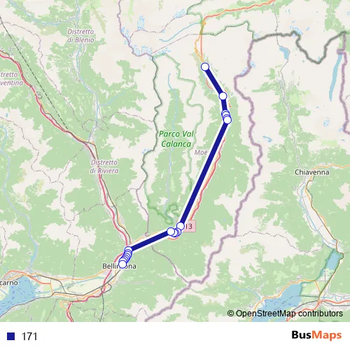 The first stop of the 171 bus route is S. Bernardino, Villaggio and the last stop is Bellinzona, Stazione. 171 is operational during täglich.