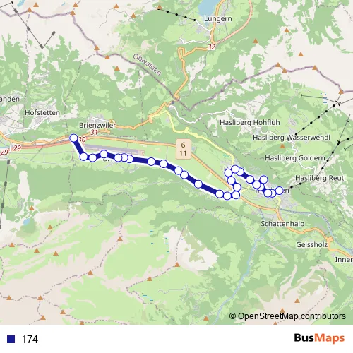 The first stop of the 174 bus route is Meiringen, Bahnhof and the last stop is Brienzwiler, Bahnhof. 174 is operational during täglich.