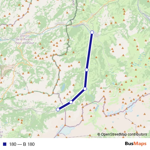 The first stop of the 180 bus route is Gstaad, Bahnhof and the last stop is Col-du-Pillon, Glacier 3000. 180 (B 180) is operational during täglich.