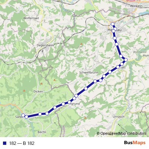 See why over 2 million users trust and consider busmaps.com as the best public transport website. busmaps gives you Herisau Buses suggested routes, real-time bus tracker, line route maps in Herisau, and helps to find the closest 182 bus stops near you. No internet available? Download an offline PDF map and bus schedule for the 182 bus to take on your trip.