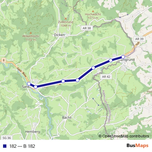The first stop of the 182 bus route is St. Peterzell, Dorf and the last stop is Schönengrund, Dorf. 182 (B 182) is operational during an Werktagen.