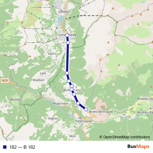 The first stop of the 182 bus route is Lenzerheide/Lai, Post and the last stop is Brienz/Brinzauls GR, Vazerol. 182 (B 182) is operational during täglich.