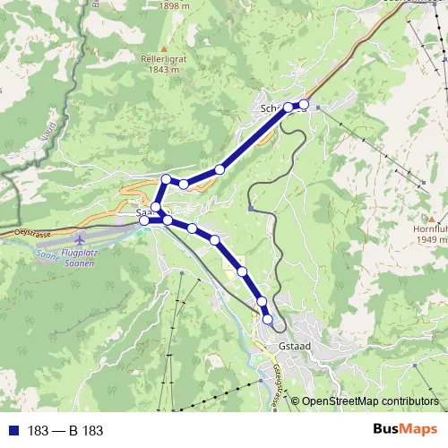 The first stop of the 183 bus route is Schönried, Bahnhof and the last stop is Gstaad, Bahnhof. 183 (B 183) is operational during täglich.