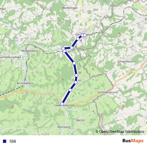 The first stop of the 184 bus route is St. Peterzell, Dorf and the last stop is Degersheim, Bahnhof. 184 is operational during täglich.