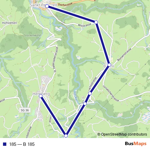 The first stop of the 185 bus route is Hemberg, Dorf and the last stop is St. Peterzell, Bächlistrasse. 185 (B 185) is operational during an Werktagen.