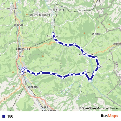 The first stop of the 186 bus route is Brunnadern-Neckertal, Bahnhof and the last stop is Wattwil, Bahnhof. 186 is operational during täglich.