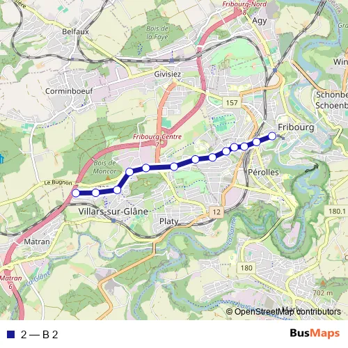 The first stop of the 2 bus route is Fribourg, St-Pierre and the last stop is Villars-sur-Glâne, Les Dailles. 2 (B 2) is operational during täglich.