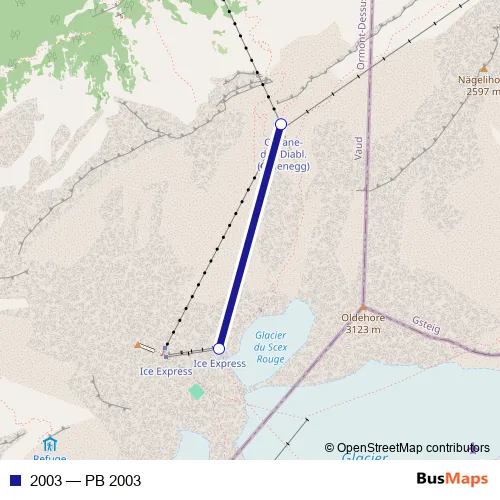 The first stop of the 2003 cable-car route is Cabane-des-Diablerets and the last stop is Glacier du Sex Rouge. 2003 (PB 2003) is operational during täglich.