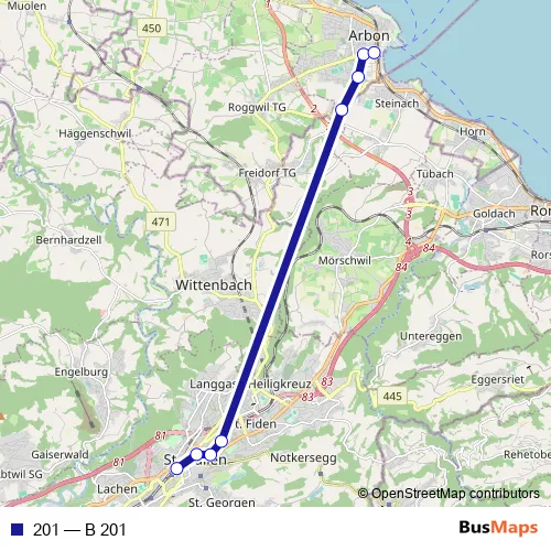 The first stop of the 201 bus route is St. Gallen, Bahnhof and the last stop is Arbon, Bahnhof. 201 (B 201) is operational during täglich.