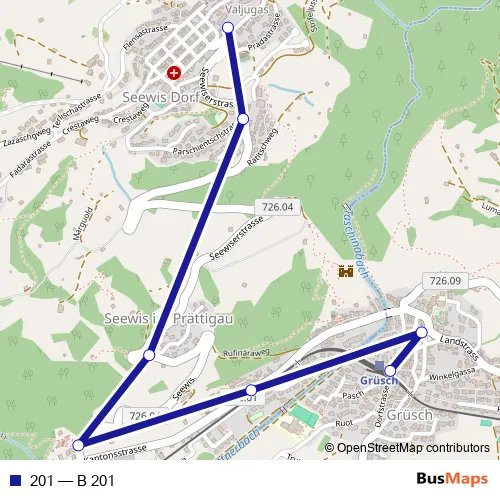 The first stop of the 201 bus route is Grüsch, Bahnhof and the last stop is Seewis Dorf, Bühelstrasse. 201 (B 201) is operational during täglich.