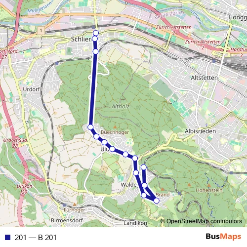 The first stop of the 201 bus route is Uitikon Waldegg, Bahnhof and the last stop is Schlieren, Zentrum/Bahnhof. 201 (B 201) is operational during täglich.