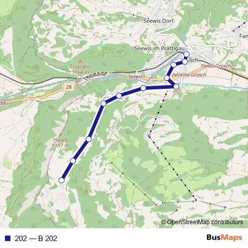 The first stop of the 202 bus route is Valzeina, Kirche and the last stop is Grüsch, Bahnhof. 202 (B 202) is operational during an Werktagen.